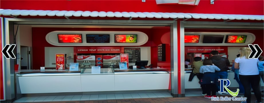 Si vous êtes à la recherche d'une collation savoureuse entre les manèges, vous trouverez ici une gamme alléchante de crème glacée molle mélangée et de fruits frais. Pour une expérience de crème glacée spéciale supplémentaire!
