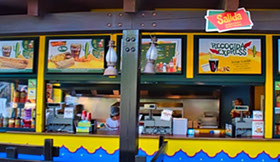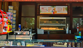 Point de restauration rapide où vous trouverez hamburgers, salades et boissons.