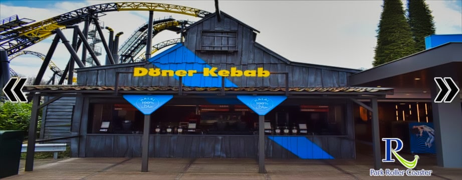 Ici, nous avons un délicieux kebab de viande certifiée halal, fraîchement sorti du gril ! Bien sûr, vous pouvez également venir ici pour de délicieuses frites. Et pendant que vous mangez votre sandwich doner, profitez des spectaculaires montagnes russes Lost Gravity en arrière-plan. Dîner avec vue !