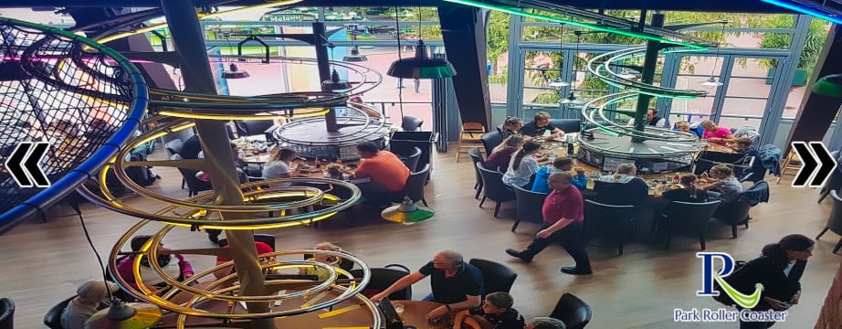 Le 1er restaurant à looping au monde ! Ici, une expérience gastronomique de haut niveau vous attend ! Le restaurant à looping « FoodLoop » propose 215 places assises sur deux étages qui offrent une vue imprenable sur le parc. Chaque table est équipée d'écrans tactiles modernes qui vous permettent de commander de nombreux plats et boissons. Via une rampe verticale, les casseroles et les bouteilles s’élèvent avant de se lancer sur un système de rails élaboré pour arriver directement à la table destinataire. Le parcours de rails spectaculaire inclus deux loopings et est unique au monde. Tout simplement extraordinaire !