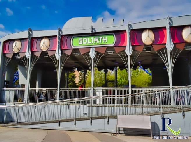 Malheureusement, pour le moment, il n'y a qu'un seul chemin vers Goliath (après Space Shot), ce qui rend parfois difficile la recherche de l'entrée. Le parvis Goliath est dominé par le grand logo, l'entrée se trouve juste derrière. Avec un fonctionnement à 2 trains, le temps d'attente est limité, car la progression est rapide (environ 30 minutes, file à moitié pleine).