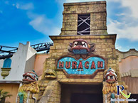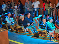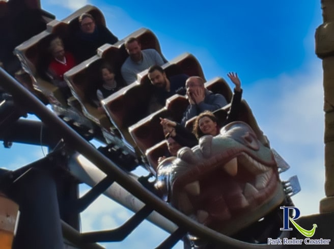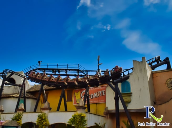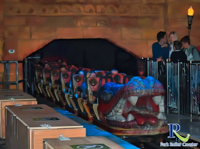 Quand on rentre dans la file d'attente, on reconnait le style de couloirs étroits qu'il y avait pour Los Piratas, mais avec un nouvel aspect. Ce sont des murs d'abord avec des dessins mayas, puis plus loin recouverts de planches. La gare d'embarquement est une pièce maya disposant de flambeaux. Le train prend son départ et nous emmène d'abord dans la partie dark ride qui dure grosso modo une trentaine de secondes: on passe entre deux chutes d'eau, puis on fait quelques zig-zag parmi différentes scènes mayas. Ensuite vient le lift qui nous fait sortir du bâtiment, avec la partie "montagne russe" à proprement parler: d'abord une descente encore à l'extérieur et toute une séries de virages, montées et descentes dans l'obscurité (pas de décors à voir dans cette partie. Avant d'arriver en gare pour la fin du périple, on fait face à une pierre ronde maya entourée de faisceaux lumineux.