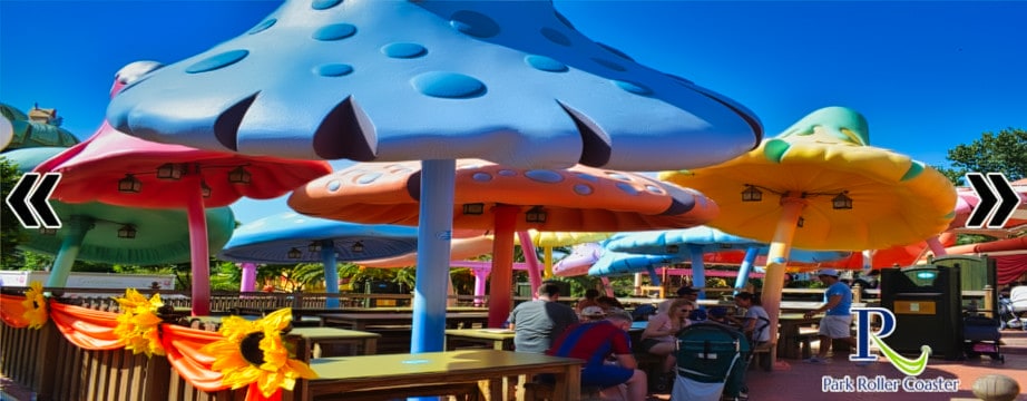 Des hamburgers bien juteux à l'ombre de champignons magiques. Les places à l'ombre peuvent être chères en saison. On peut aussi manger devant le spectacle SesamoAventura.
