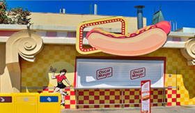 Nous sommes sur Hollywood Boulevard, Parque Warner. Bien commencer ou terminer notre parcours à travers le parc dépend de notre arrêt à ce classique : les Hollywood Hot Dogs.