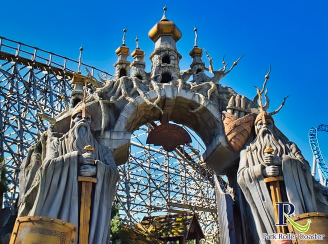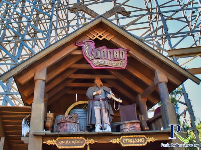 Dès que vous entrez dans la région islandaise, vous pouvez voir la structure en bois de Wodan. Les montagnes russes en bois séparent parfaitement le parc de la rue derrière lui et renforcent l’effet d’un espace thématique autonome. L'entrée réelle des montagnes russes se trouve derrière un immense portail qui rappelle un peu les films du Seigneur des Anneaux. De là, vous arrivez dans un petit village dont les maisons sont couvertes de toits en herbe. Tout est un peu médiéval et il y a aussi un petit feu de camp à voir.