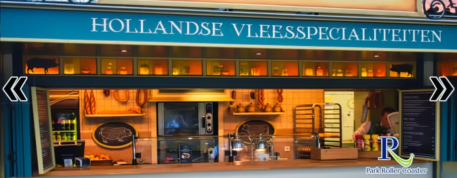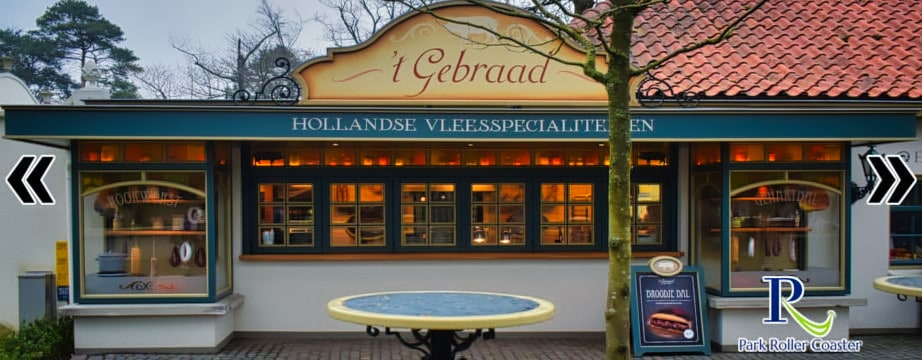 La gamme de 't Gebraad se compose de boulettes de viande traditionnelles, de saucisses à moitié fumées, de ces deux types de viandes sur du pain au sol avec sauce et garniture, de boissons gazeuses et de bière..