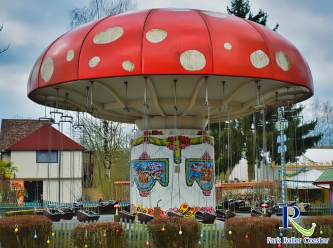 Le carrousel à balançoires se présente sous la forme d'un champignon surdimensionné et s'intègre parfaitement dans le magnifique paysage floral de Freizeit-Land Geiselwind.