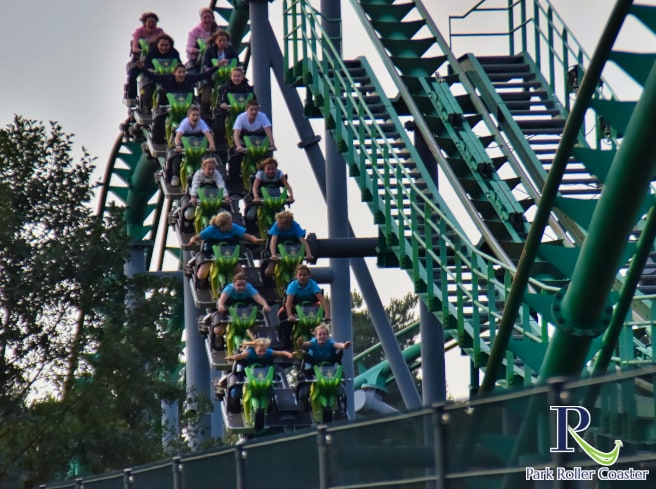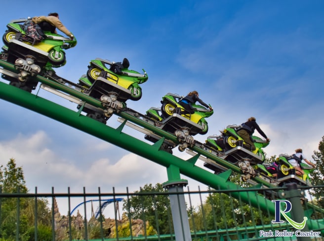 L'itinéraire se démarque agréablement des schémas de montagnes russes précédents et comporte de nombreuses courbes abruptes, des changements de direction et un total de 3 dos de chameau. La particularité de ces montagnes russes est certainement les chaises de moto, qui offrent suffisamment d'espace pour les personnes de 1,40 m à 2 m. Vous montez sur la selle de la moto et adoptez la posture courbée typique, dans laquelle le guidon est utilisé pour tirer la barre arrière vers votre corps et la verrouiller en place. Très pratique et surtout la clé d'une expérience de conduite complètement différente.