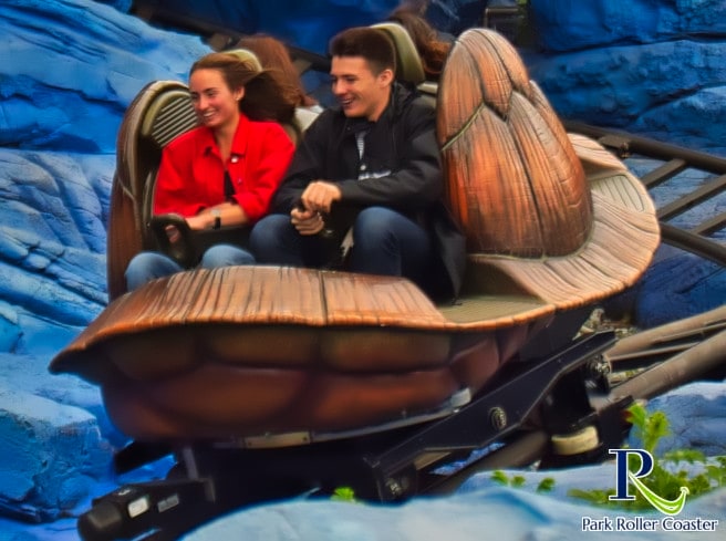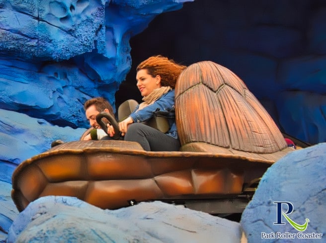 les visiteurs rencontrent Bruce et invite ses requins « danger pour les poissons ». L’évasion ultérieure a lieu via un ascenseur à chaîne très rapide. À partir de maintenant, les montagnes russes suivent et vous tournez à travers le sous-marin. Encore et encore, la tortue tourne et tourne, de sorte que parfois vous avancez, parfois en arrière. La balade reste cependant toujours conviviale et familiale, toutes les transitions sont calmes et harmonieuses. On ne remarque pratiquement pas de saccades ici. Malheureusement, le spectacle à travers la mer sombre et profonde est rapidement terminé.