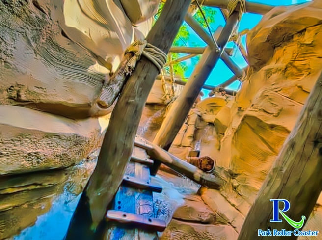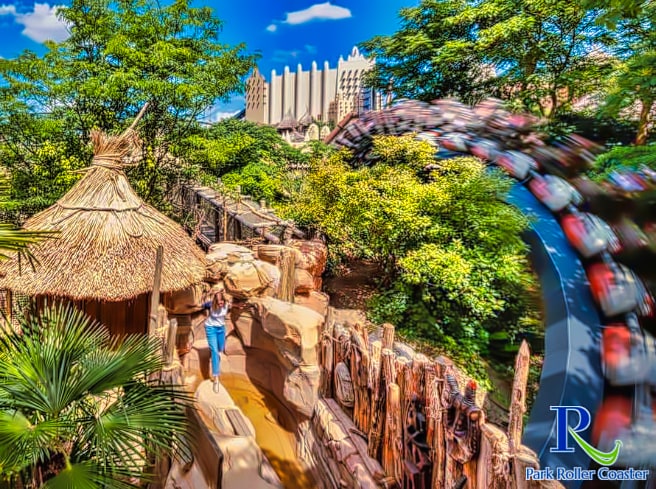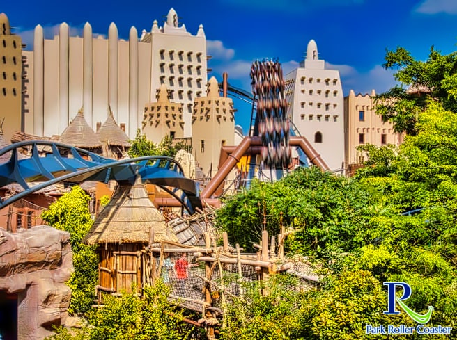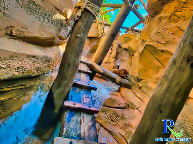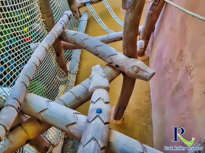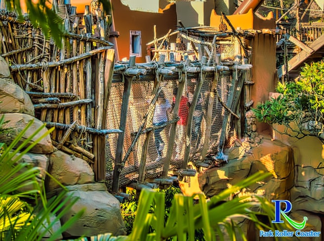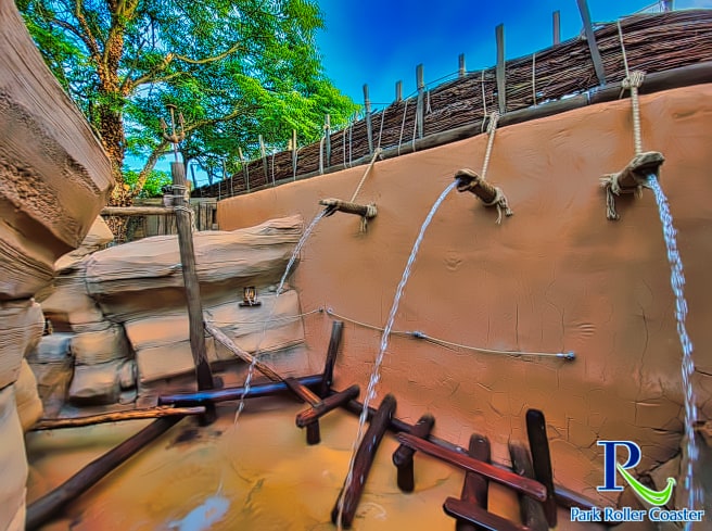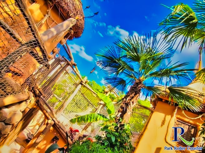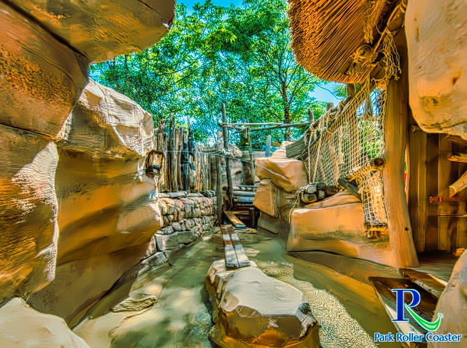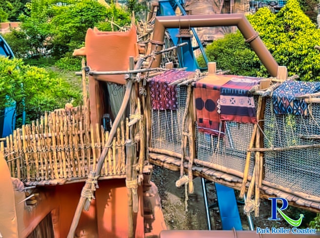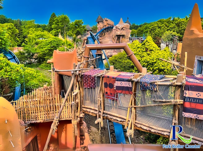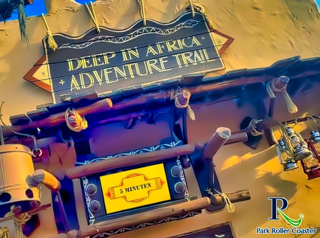 Le 'Deep in Africa - Adventure Trail' offre exactement ce qu'il promet dans son nom. Ce sentier rempli d'obstacles serpente à travers la zone à thème africain du parc et s'entremêle de manière impressionnante avec les montagnes russes inversées Black Mamba, qui abritaient seize saisons plus tôt. En cours de route, le sentier se divise plusieurs fois, ce qui permet quelques variations sur l'itinéraire si vous visitez plusieurs fois l'Adventure Trail.