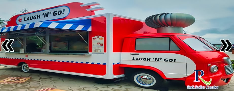Il s’agit, comme le poids lourd de la scène « CARS-tastrophe Canyon » d’un personnage inédit dans l’univers de la franchise CARS. Ses couleurs rouge, blanc et bleu sur sa carrosserie rappellent justement les couleurs principales de la marque Vache qui rit. Sur la terrasse, des tables avec des chaises sont à disposition des clients du food truck, avec de jolis parasols thémés. Le « food truck » Laugh ‘n’ Go! propose donc des produits à base de Vache qui rit comme un croque monsieur à l’effigie de Flash McQueen.