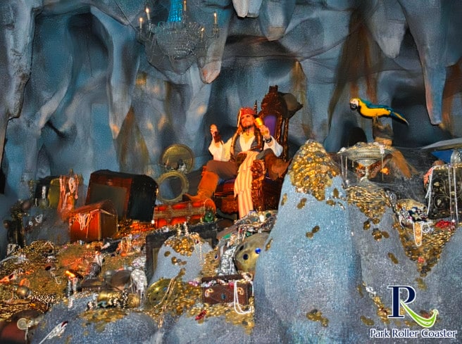 À l'automne 2003, un film du même nom (en Allemagne: Pirates des Caraïbes) est sorti dans les cinémas internationaux, basé sur l'histoire de Dark Ride autour du trésor de la perle noire. Le film est devenu une véritable superproduction et a reçu à ce jour (jusqu'en 2017) 4 autres suites de la dernière en mai 2017 dans les cinémas allemands. Il n’est donc guère surprenant que le voyage thématique s’oriente un peu vers le cinéma, ce qui a finalement été fait après une longue rénovation et une amélioration en juillet 2017. Alors maintenant, certains personnages populaires du film font partie de l'attraction pour la première fois: Alors que l'on rencontre le capitaine Barbossa avec une équipe de squelettes, Davy Jones et Blackbeard apparaissent sous la forme de fantômes. Le pirate culte Jack Sparrow a même deux apparitions dans l’attraction populaire. Tout d'abord, il se cache dans un tonneau derrière un pirate portant la célèbre carte au trésor. Plus tard, il s’assoit triomphant entre l’or et les bijoux.
