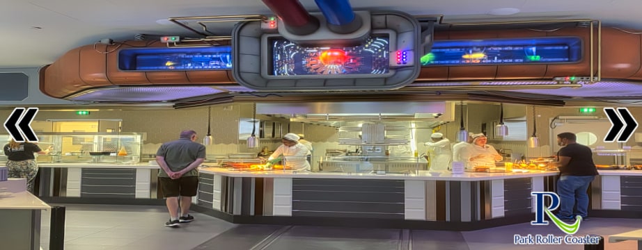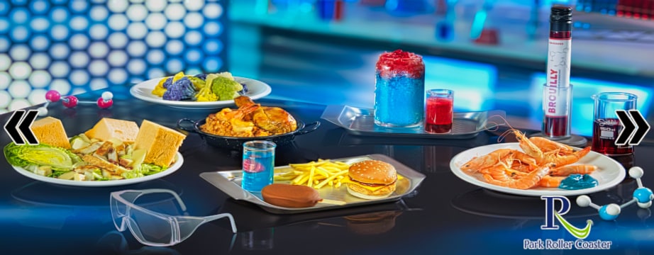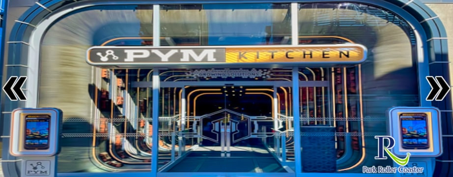 orsque nous entrons dans le restaurant, nous sommes immédiatement transportés dans l’ambiance. Les castmembers en blouse blanche et l’architecture ne laissent pas de place au doute : nous sommes bien dans un laboratoire. En face de l’entrée, un écran fait défiler des aliments et les agrandit ou les rétrécit, nous donnant une idée de ce que l’on va voir par la suite.