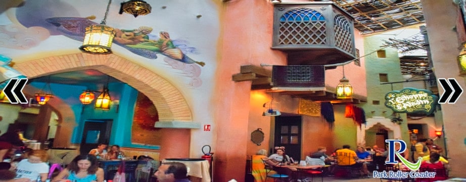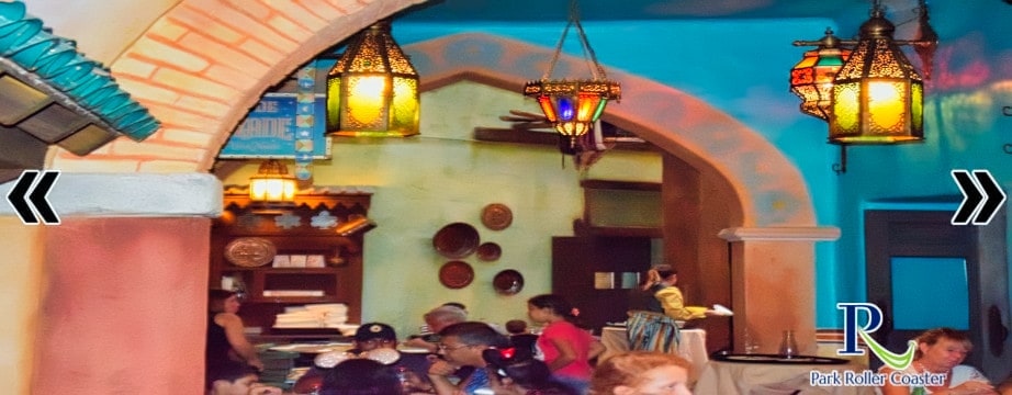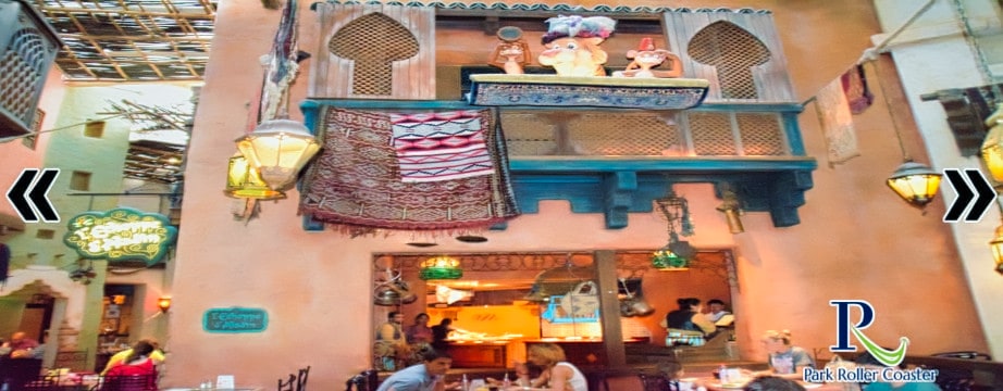 Descendez de votre tapis volant et venez prendre place dans les dédales enchanteurs d'un antique bazar d'Arabie, le Agrabah Café. Imprégnez-vous de l'ambiance survoltée qui règne dans ce Land et, si vous êtes attentif, vous pourrez apercevoir Aladdin.