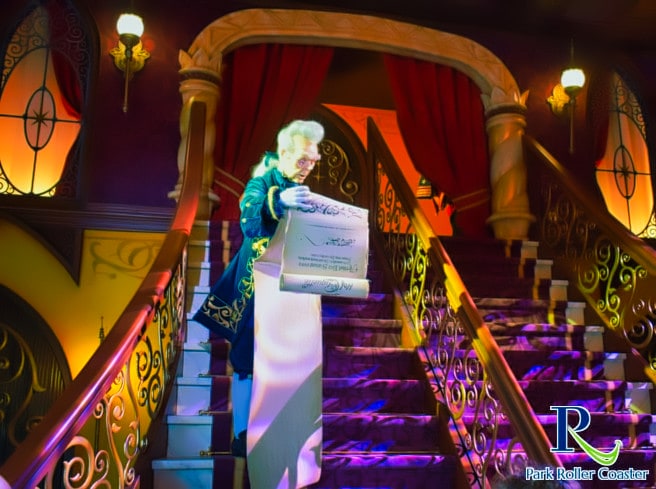 Dès que vous avez passé les deux pavillons, vous montez les escaliers et vous êtes accueilli en pré-spectacle par le valet OJ Punctuel, qui vous lit le règlement royal. Mais peu de temps après, il est interrompu par la mascotte d'Efteling, Pardoes, qui laisse entrer les invités dans le palais par un passage secret. Descendez maintenant les escaliers, où vous avez le choix entre l'un des 3 circuits possibles (héros, trésors ou circuit musical), . Cependant, ceux-ci ne diffèrent que dans un espace interactif, qui est de toute façon l'une des sections les plus faibles de Symbolica. Parce qu'en soi, Symbolica est thématiquement irréprochable et simplement une balade merveilleusement thématique qui se serait plutôt bien passée d'un parc interactif.