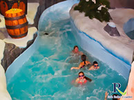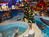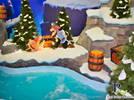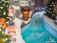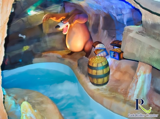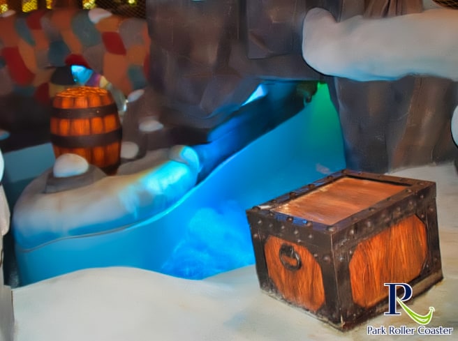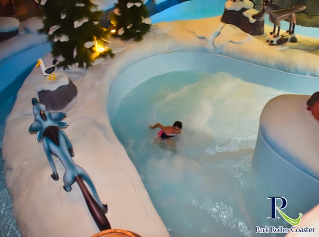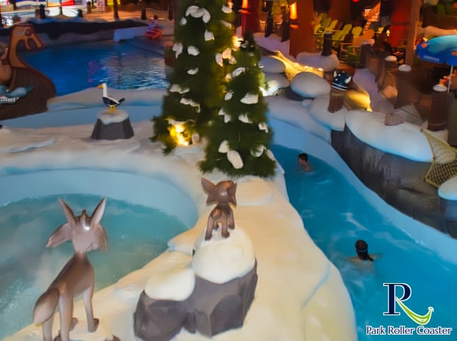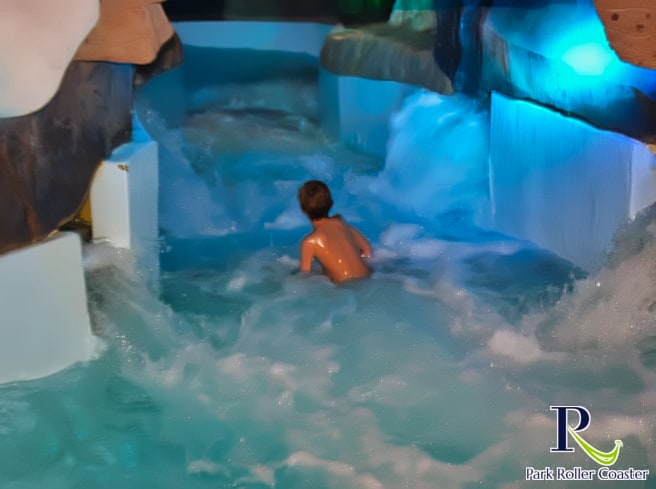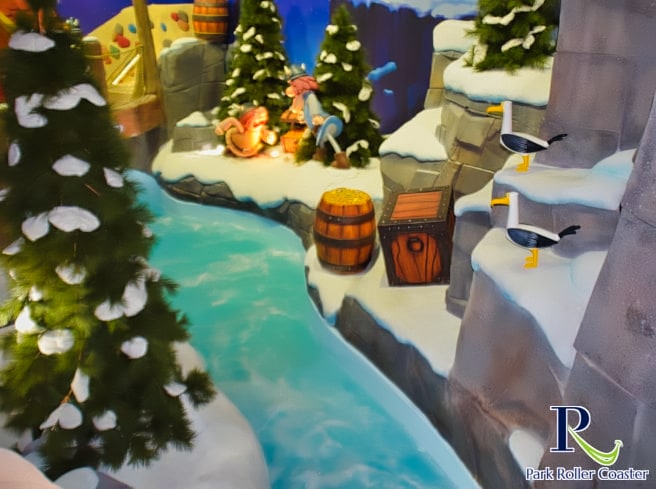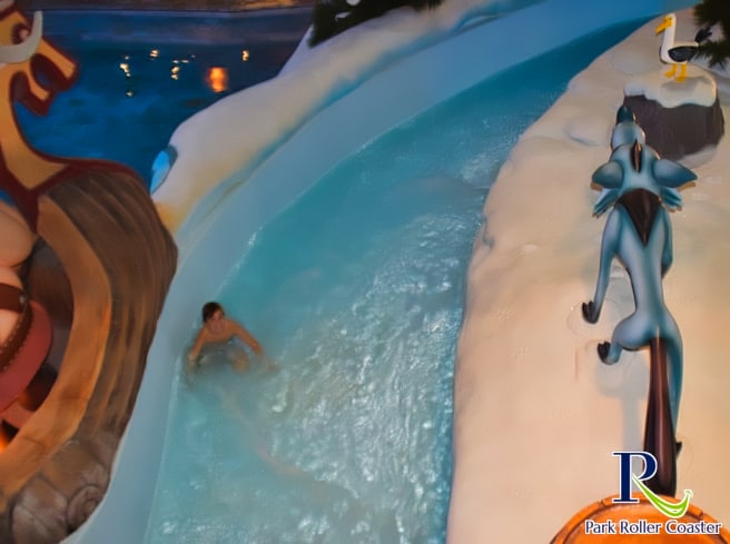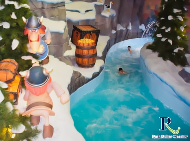 Un escalier partant de la zone de sortie de la rivière Sauvage mène à l'entrée de la rivière d'eau vive. Elle se présente ici comme une rivière glaciaire et vous passez ainsi devant une grotte avec des personnages du monde de Wickie ainsi que des zones de neige dans la partie inférieure, qui sont vraiment bien réalisées.